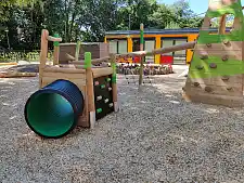 Die Architektur richtet sich entsprechend KiTa Bremens Trägerkonzept nach den Bedürfnissen eines Kinder- und Familienzentrums: Neben den Gruppenräumen und einer modernen Küche sind Begegnungs- und Bewegungsräume Teil des Konzepts. Ebenso ist ein Büro für den*die Koordinator*in, ein Frühförderraum, mehrere Differenzierungsräume und ein Atelier vorhanden. Das Restaurant hat eine kleine Küche, um dort mit Kindern und Eltern zu kochen. Eine Außenspielanlage rundet die Gestaltung der neuen Einrichtung ab.