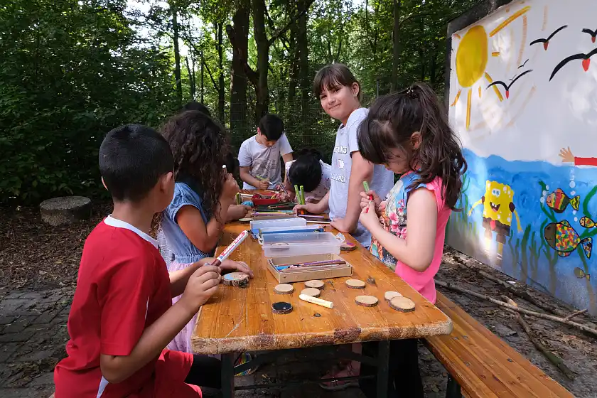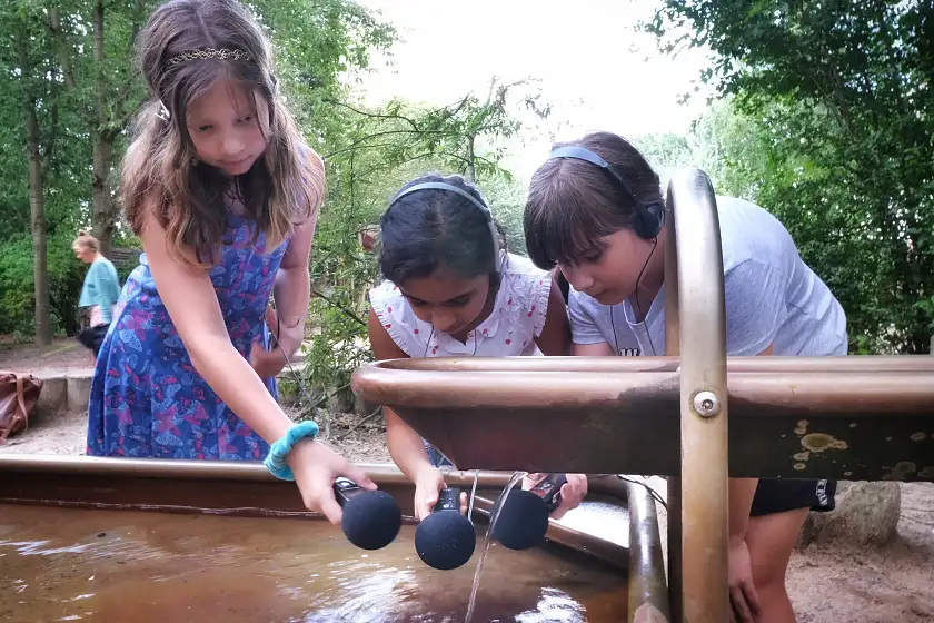 Die Kinder machen sich zunächst auf die Suche nach ihren Lieblingsplätzen im Bremer Stadtteil Kattenturm. Sie besuchen unter anderem die lokale Eisdiele, den naheliegenden „Funpark“ und das Ufer des angrenzenden Fleets – Plätze, die später auch als Handlungsorte des Hörspiels dienen. „An den Lieblingsorten der Kinder haben wir überlegt, welche Klänge wir hören wie Regengeräusche oder das Motorendröhnen von vorbeifahrenden Autos.“, berichtet Kathrin Dröppelmann. Mit Aufnahmegeräten halten die jungen Hörspielproduzent*innen die Geräusche fest und erzeugen eigene Klänge. Am Ende der ersten Woche entsteht eine vielfältige Soundsammlung, die Phase zwei des Projektes einleitet.
