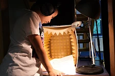 Zurück im Spielhaus/Treff Wischmannstraße verwandelt Norman Neumann in der zweiten Projektwoche mit den Kindern den Gruppenraum in ein Tonstudio. Schallschluckender Stoff und Schaumstoff sorgen dabei für gute Aufnahmebedingungen. Abwechseln schlüpfen die jungen Sprecher*innen in die provisorische Aufnahmekabine und vertonen die vorher gemeinsam erarbeitete Hörspielgeschichte von den Aliens Mok Mok, Ditto & Bim Bam.