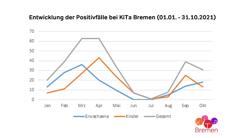 Seit Ende der Sommerferien steigen die Fallzahlen bei KiTa Bremen wieder. Die Schließzeiten während der Herbstferien sind der Grund für den Rückgang der Positivfälle bei Erwachsenen und Kindern im Oktober. Ab November (noch nicht abschließend ausgewertet) steigen die Infektionszahlen wieder. Die folgende Grafik stellt die Entwicklung von Positivfällen bei KiTa Bremen dar: