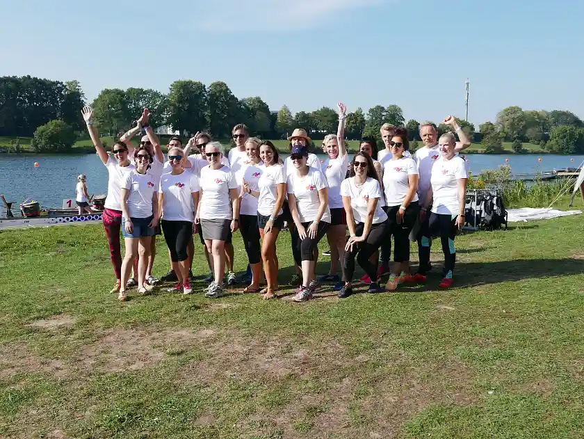 05.09.2019 – Are you ready? Attention! GO! Unter diesem Kommando starteten am vergangenen Samstag, den 31. August 2019, zwei paddelstarke KiTa Bremen-Boote beim Drachenboot Cup. Das Team, bestehend aus rund dreißig KiTa Bremen-Mitarbeiter*innen, trat beim Rennen auf dem Bremer Werdersee in der Kategorie „Fun“ an. In drei Durchläufen ließen die Teilnehmenden auf einer Strecke von jeweils 250 Metern die Paddel glühen - und das mit Erfolg: Von insgesamt fünfzehn „Fun“-Teams belegten die zwei KiTa Bremen-Boote den vierten und den zwölften Platz. Für neue Kraft zwischen den einzelnen Rennen sorgte ein gemeinsames Team-Picknick am Seeufer.