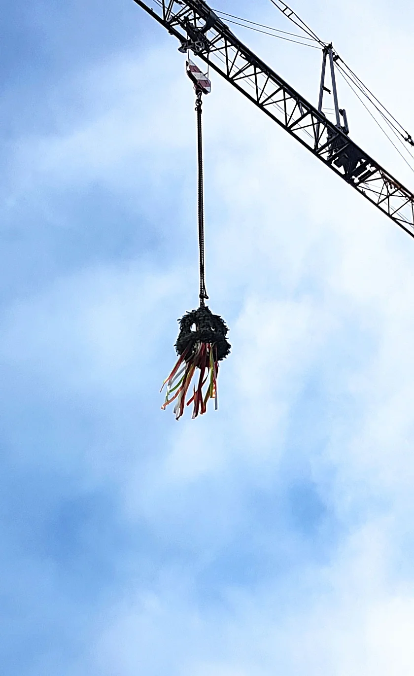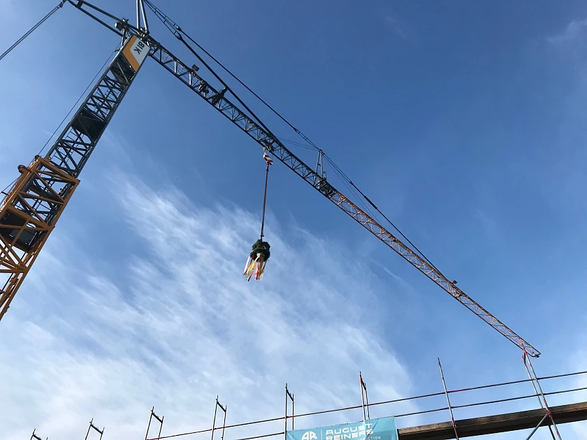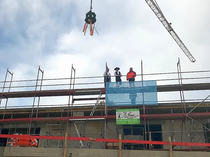 20.11.2019 – Am vergangenen Donnerstag, den 14. November 2019, zog sich feierlich der Richtkranz des Kinder- und Familienzentrums Helsinkistraße empor. Nach der ersten Hälfte der Bauzeit präsentiert sich der rund 1200 Quadratmeter große Rohbau erstmals der Öffentlichkeit. Beim Richtfest bedankten sich Dr. Claudia Bogedan, Bremens Senatorin für Kinder und Bildung, und Wolfgang Bahlmann, Geschäftsführer von KiTa Bremen, bei den Architekten*innen und Handwerker*innen für die geleistete Arbeit. Vor Projektbeteiligen, Mitarbeiter*innen und Elternvertreter*innen drückten beide ihre Freude über KiTa Bremens zweiten Standort im Bremer Stadtteil Marßel aus. Das neue Gebäude wird den Mobilbau in der Helsinkistraße voraussichtlich im August 2020 ersetzen.