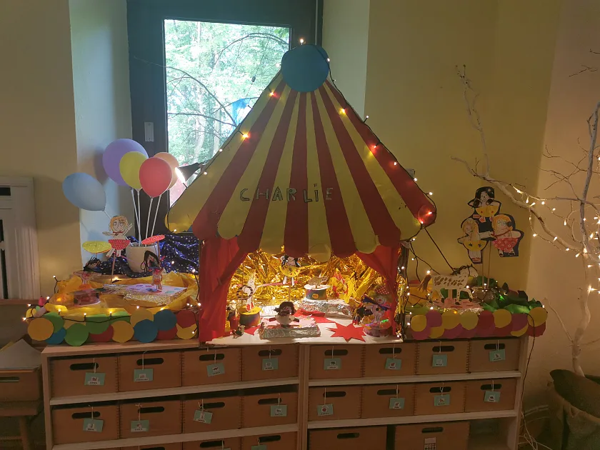 Die Zirkusstimmung schlug auf das ganze Familienzentrum über. Inspiriert von Kostümen und Kunststücken bastelten viele Kinder farbenfrohe Zirkusnachbildungen. Eltern konnten die ausgestellten Arbeiten, Fotos und Videos der Kinder am Ende der Projektzeit vor den Räumen des Kinder- und Familienzentrum bestaunen. Ein beschwingendes Erlebnis für alle Beteiligten.