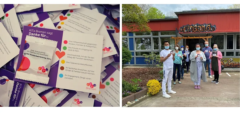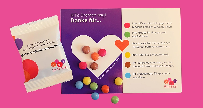 Mit der kleinen Aufmerksamkeit schließt sich KiTa Bremen dem bundesweiten Aktionstag an, um dem Engagement und der enormen Leistung aller Fachkräfte in der frühkindlichen Bildung Ausdruck zu verleihen. Bei KiTa Bremen unterstützen mehr als 1.600 pädagogische Fachkräfte, über 400 hauswirtschaftliche Mitarbeitende und viele persönliche Assistenzen Kinder und ihre Familien bei den großen und kleinen Herausforderungen des Lebens.