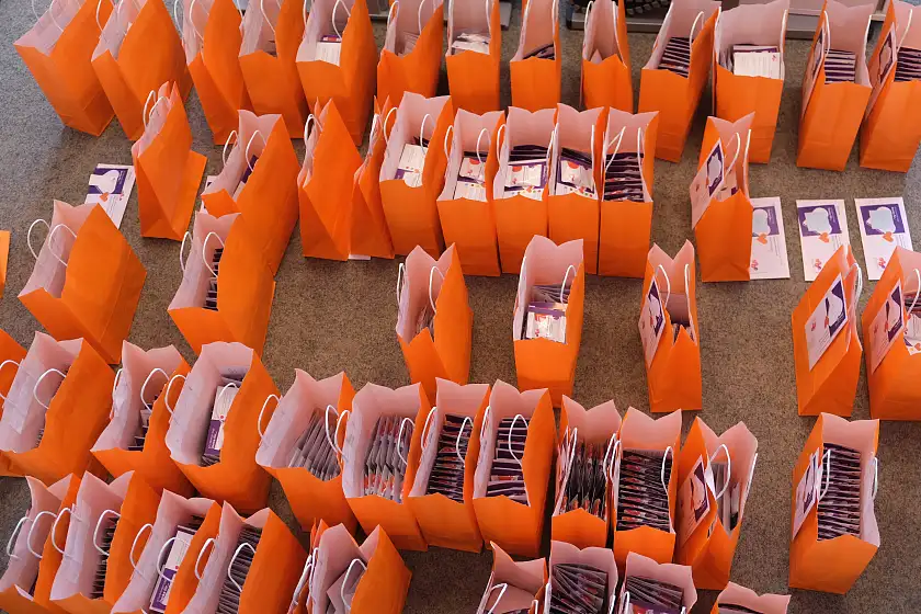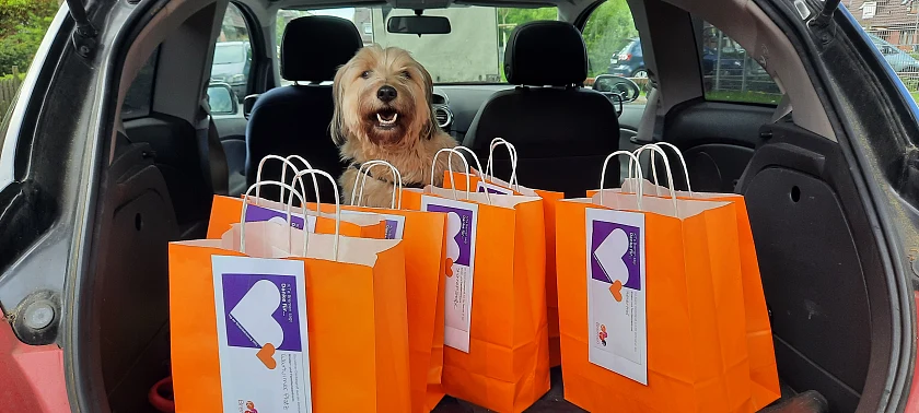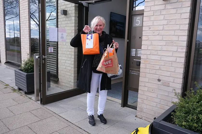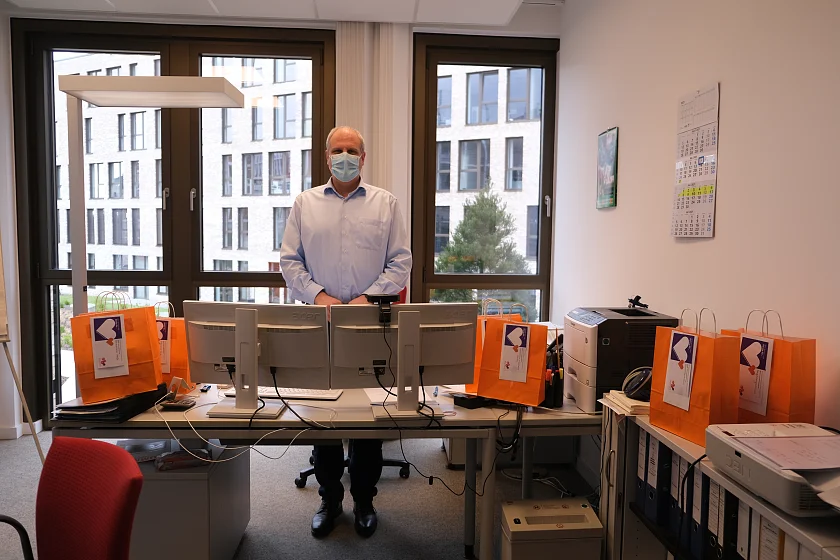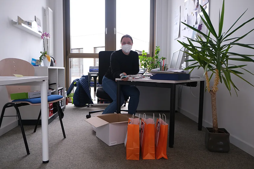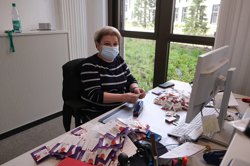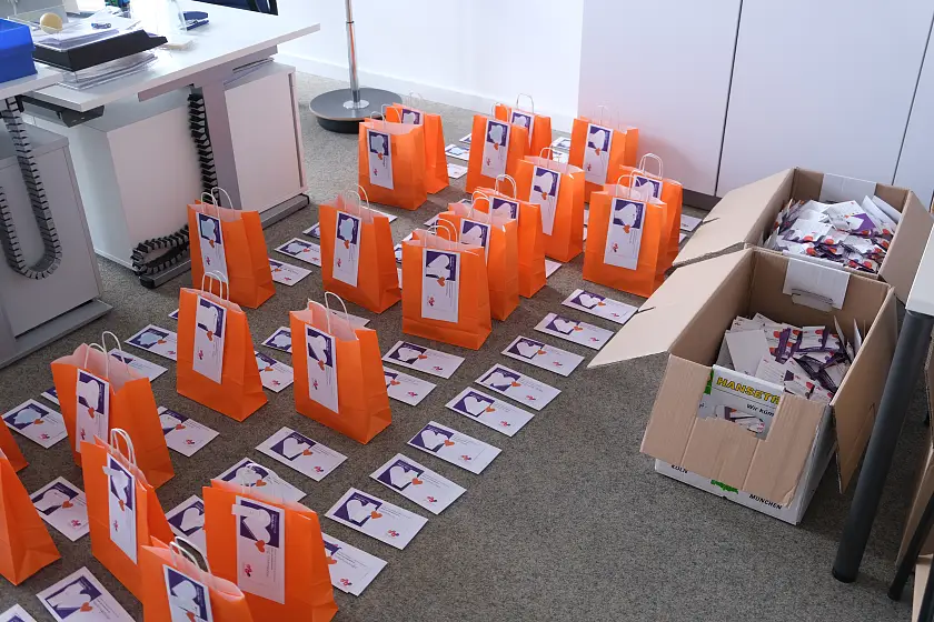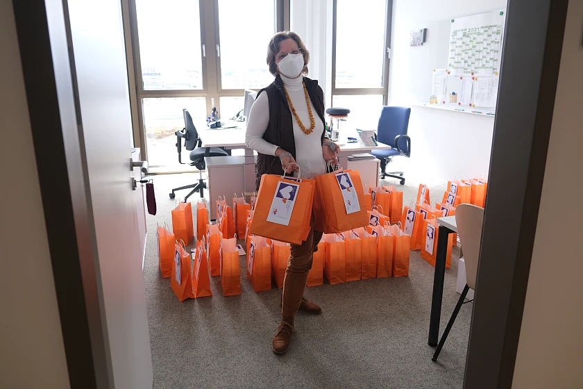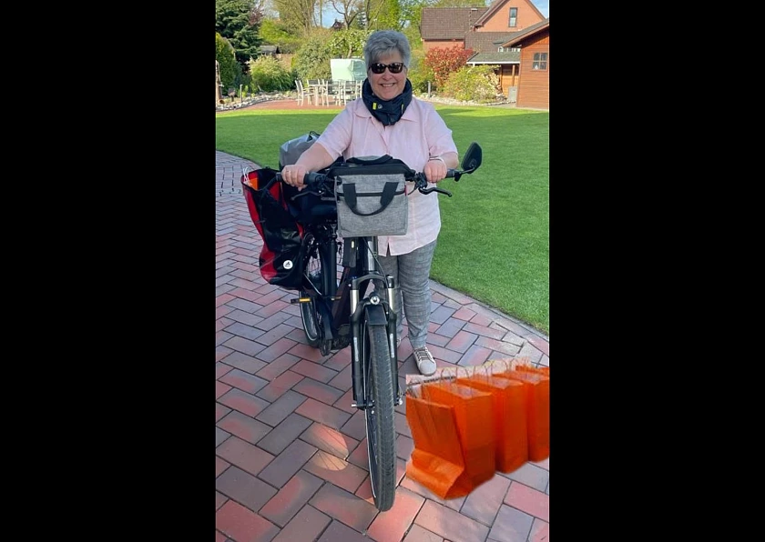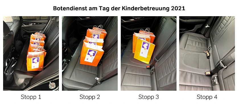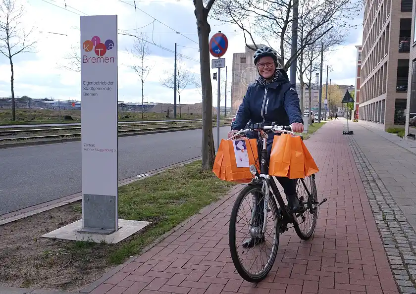 10.05.2021 – Ob baumelnd am Fahrradlenker oder im vollgepackten Kofferraum - 89 gepackte Tüten warten heute auf ihre Auslieferung an die Kinder- und Familienzentren. Anlässlich des Tages der Kinderbetreuung überbringen Mitarbeitende aus der Zentrale allen Einrichtungen von KiTa Bremen einen „süßen“ Dankesgruß in Form von 2.500 Grußkarten und Schokolinsen – jede Farbe der Linsen steht dabei für einen individuellen Dank.