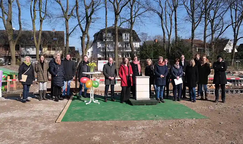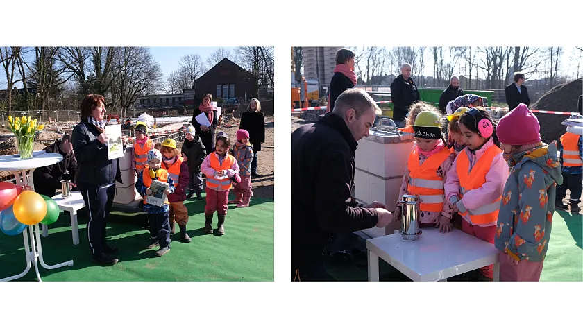 09.03.2022 – Am Mittwoch, den 2. März 2022, fand die feierliche Grundsteinlegung für den Neubau des Kinder- und Familienzentrums Fährer Flur in Bremen-Nord statt. Unter Anwesenheit von Sascha Aulepp, Senatorin für Kinder und Bildung, und Petra Zschüntzsch, stellvertretende Geschäftsführerin und pädagogische Leiterin von KiTa Bremen, wurde der Startschuss für das zweistöckige Bauprojekt gegeben. „Wir freuen uns sehr, dass im Frühjahr 2023 vier Elementar- und zwei Krippengruppe in einen Neubau einziehen können“, erklärt Petra Zschüntzsch. „Zusammen mit dem Neubau der Grundschule und der Sanierung der denkmalgeschützten Turnhalle lassen wir mit dem neuen Kinder- und Familienzentrum den Bildungscampus Fährer Flur für Kindern von null bis zehn Jahren entstehen.“