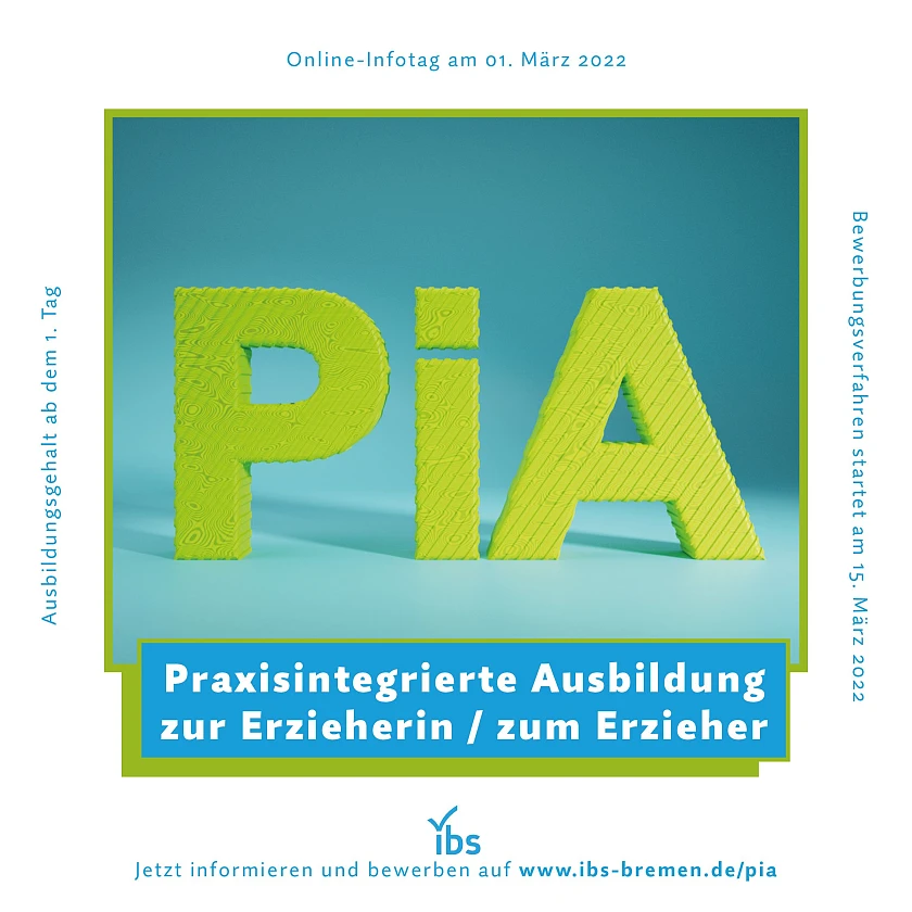 10.02.2022 – Das Modellprojekt PiA geht im Sommer 2022 am Institut für Berufs- und Sozialpädagogik (ibs) in eine neue Runde. Die Ausbildung zum staatlich anerkannten Erzieher und zur staatlich anerkannten Erzieherin erfolgt praxisintegriert: Theorieunterricht und praktischer Einsatz wechseln sich über die gesamte Ausbildungszeit von drei Jahren ab. Auch KiTa Bremen beteiligt sich wieder am Programm und wird 2021 rund 20 Praxisstellen vergeben. Das Bewerbungsverfahren beginnt am 15. März 2022.
