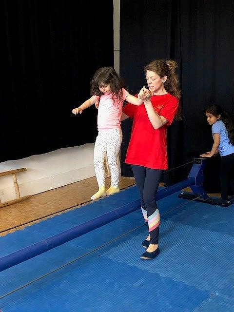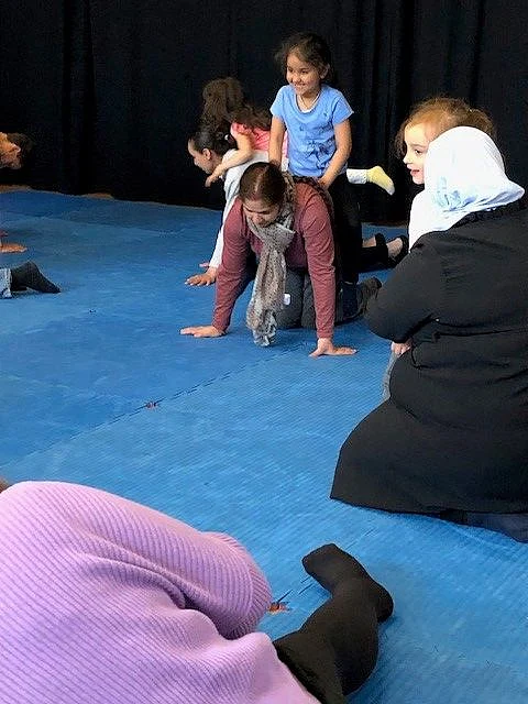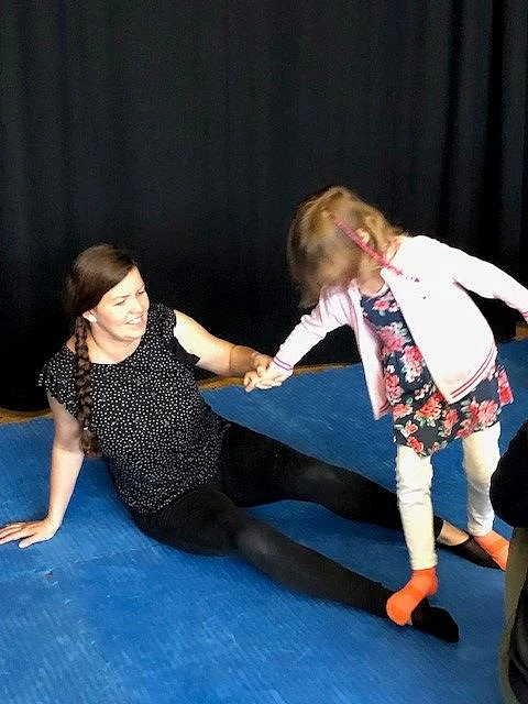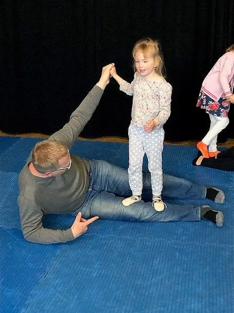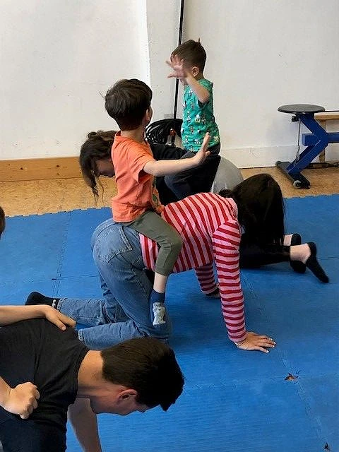 In der Zirkusschule angekommen, verwandelten sich die erwartungsvollen Gesichter innerhalb von zehn Minuten in lachende. Zu Beginn erlebten die Kinder direkt ein spannendes Abenteuer: Eine Mitmachgeschichte ließ sie zu Baumstämmen werden, über einen Bach balancieren, sich in Tiere verwandeln und sogar Karussell fahren. Immer mit dabei waren die Personen aus den Familie, die die Kinder in die Zirkusschule begleiteten und die drei "Profi-Artist:innen".