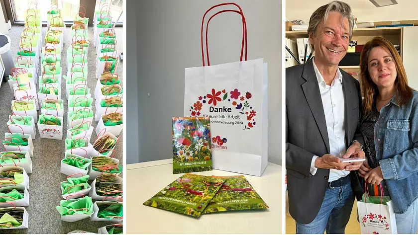 Als Ausdruck der Wertschätzung besuchten Mitarbeitende der Zentrale an diesem Tag alle Einrichtungen und überreichten symbolische Dankesgrüße. In bunten Geschenketüten warten verschiedene Blumensamen darauf, von den Einrichtungsteams gepflanzt zu werden - eine Metapher für das liebevolle Wachstum, das KiTa Bremens Mitarbeitende Kindern und ihren Familien ermöglichen.