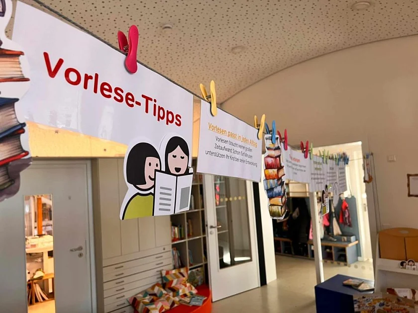 In den Eingangsbereichen der beiden Häuser des Waller Parks luden gemütlich eingerichtete Leseecken sowie kleine Lese-Runden – unter anderem mit der Erzählschiene – die Kinder zum Schmökern, Zuhören und Mitmachen ein. Auch draußen gab es besondere Erlebnisse: Beim Story Walk wurden Geschichten auf kreative Weise mit Fotos zum Leben erweckt.