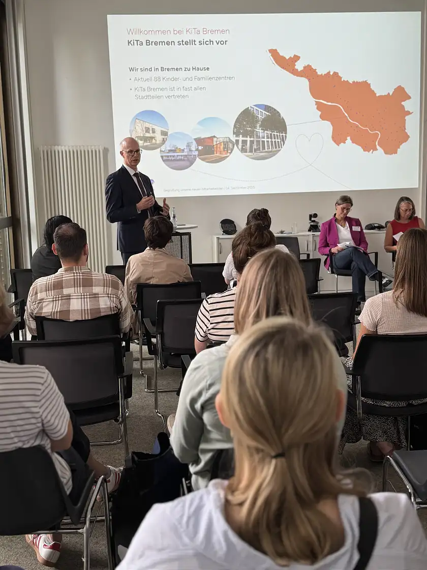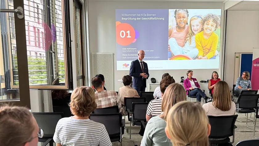 05.09.2025 - Mit viel Energie und Vorfreude starteten in den letzten Monaten über hundert neue Mitarbeitende bei KiTa Bremen in ihren neuen Arbeitsalltag. Bei der jährlichen Begrüßungsveranstaltung in der Zentrale stand am 4. September nicht nur das Kennenlernen im Mittelpunkt, sondern auch das gemeinsame Verständnis für die wichtige Aufgabe, die Kinder- und Familienzentren als Orte der Vielfalt und Teilhabe zu gestalten.
