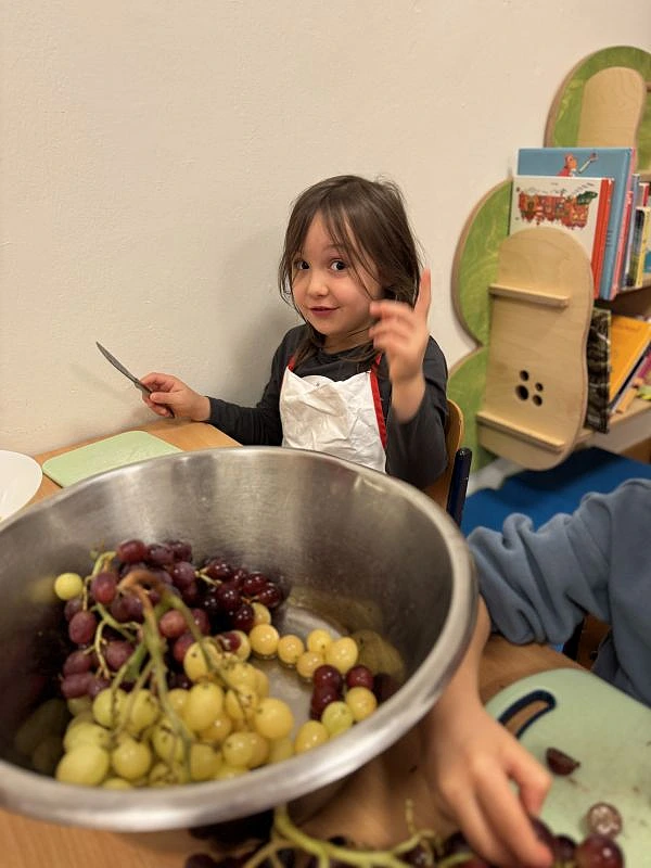 Pädagogisch wird hier viel Wert auf Selbstständigkeit und verantwortungsvollen Umgang gelegt: Beim Schneiden mit echten Messern begleitet der Erzieher die Kinder aufmerksam. Wer den Umgang von zu Hause schon kennt, darf unter Beobachtung selbst schneiden, unerfahrene Kinder werden behutsam herangeführt. So entdecken die Kinder ganz spielerisch, wie man Obst sicher schneidet, worauf man in der Küche achten muss und wie viel Freude es macht, aus einzelnen Zutaten gemeinsam ein leckeres Frühstück zu "zaubern".