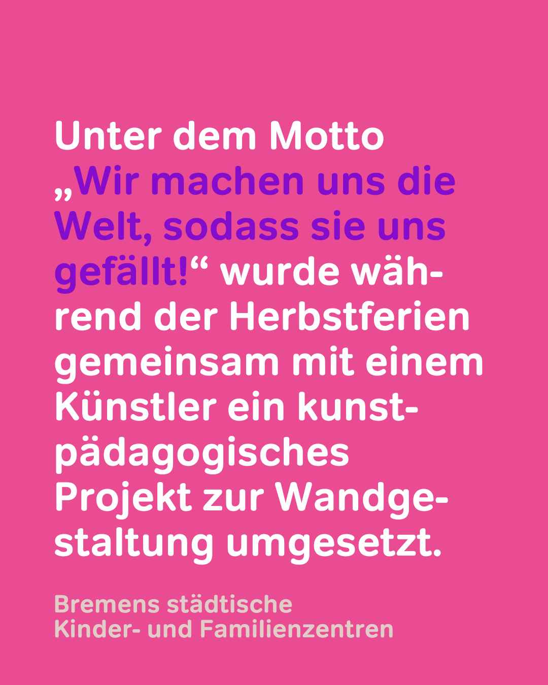 Unter dem Motto: „Wir machen uns die Welt, sodass sie uns gefällt!“ wurde während der Herbstferien gemeinsam mit einem Künstler ein kunst-pädagogisches Projekt zur Wandgestaltung umgesetzt. - Datei öffen/herunterladen (jpg, 85.1 KB) -