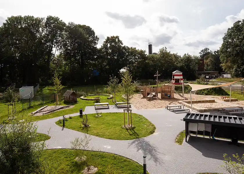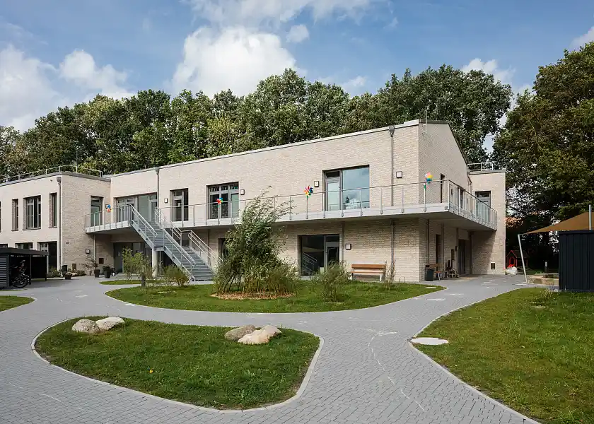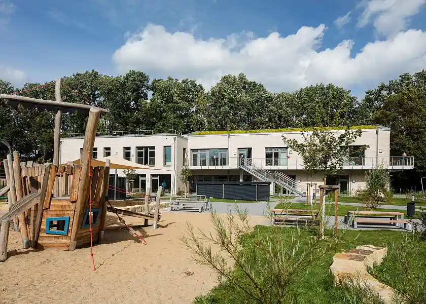 Am 1. September 2017 eröffnete unser Kinder- und Familienzentrum Fährer Flur, übergangsweise befand sich der Kindergarten in einem Mobilbau. Seit dem 1. Juni 2023 befindet sich unser Kinder- und Familienzentrum am gleichen Standort, nun in einem hellen und gemütlich eingerichteten Neubau. Unser Außengelände ist sehr groß und bietet den Kindern viele Anregungen die sie für ihre Entwicklung brauchen. Es lädt zum Schaukeln, Rutschen, Balancieren und Experimentieren ein. Seitlich und hinter dem Haus haben wir einen kleinen Wald. Der Wald ist ein Lernort für die Kinder, gespielt und geforscht wird im Wald mit dem was die Natur den Kindern dort bietet.