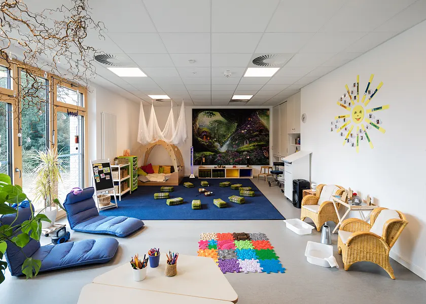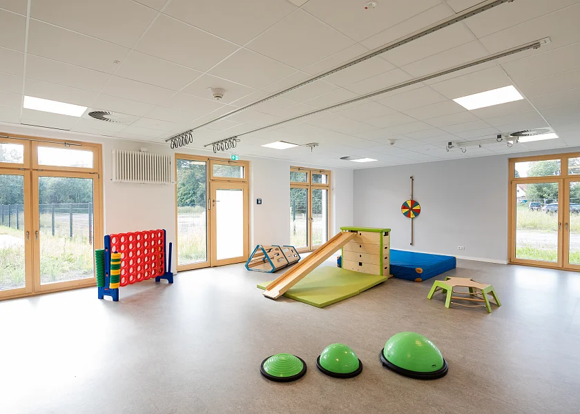 Zudem bieten unsere breiten Flure viele Spielmöglichkeiten und Ruhebereiche den Kindern.