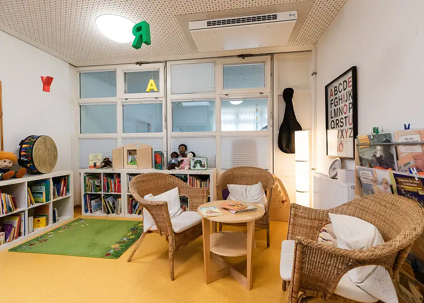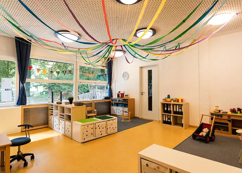 Die Kita hat 7 Gruppenräume und 4 Differenzierungsräume, von denen einer für Sand- und Wasserspiele, Forschen und Experimentieren eingerichtet ist. Ein weiterer Raum ist mit einem Bällebad ausgestattet und als Bewegungsraum nutzbar und einen Raum haben wir als Lese- und Elternraum kombiniert hergerichtet.