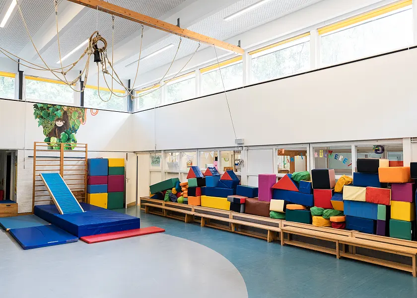 Mittelpunkt unserer Kita ist eine große Mehrzweckhalle mit Schaukeln, Geräten, großen Matten und vielen Schaumstoffblöcken für vielfältige Bewegungserfahrungen und „Bewegungsbaustellen“, die oft aufgebaut werden.