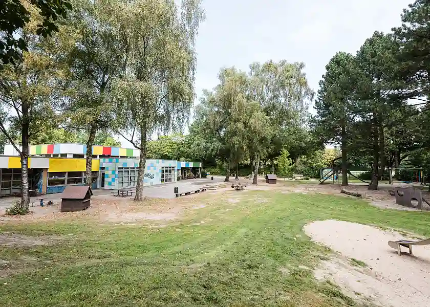 Um die Kita herum ist ein großes Außengelände (6.700 qm) mit Spielgeräten wie Schaukeln, Hängebrücke, Rutsche, Karussell, dicken Baumstämmen zum Balancieren, Röhren zum Durchkrabbeln, Holzhütten und Sandkisten. Auf dem Gelände ist ein kleiner Berg, umrandet ist das Gelände mit Büschen zum Verstecken, Höhlenbauen usw.