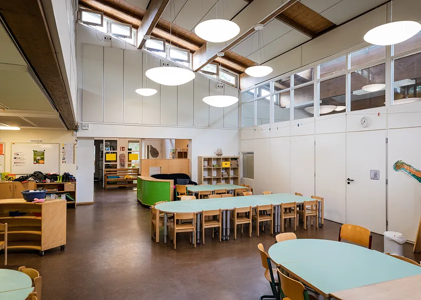 Den Kindern stehen die nach Schwerpunkten eingerichteten Räume, eine große Bewegungshalle,
