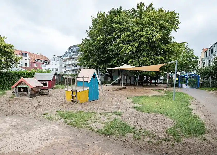 ein Kinderrestaurant und eine Bücherecke in der Halle, sowie das vielfältige attraktive Außengelände zum selbsttätigen Lernen zu Verfügung.