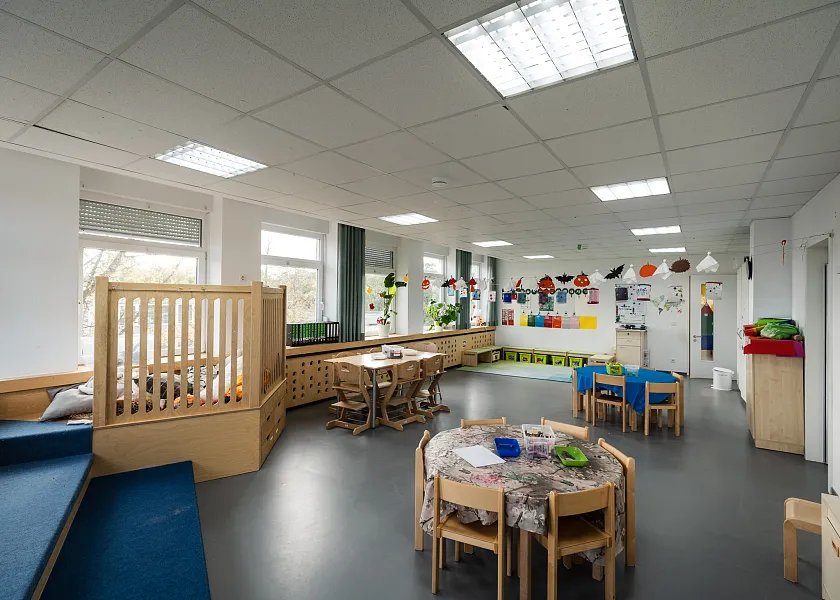 Es stehen insgesamt 60 Plätze zur Verfügung, davon 20 in der Krippe für Kinder von 1 bis 3 Jahren und 40 Plätze im Elementarbereich für Kinder ab 3 Jahren bis zum Schuleintritt.