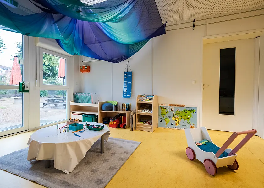Unser Betreuungsangebot: Derzeit bieten wir 60 Plätze in einem alterserweiterten Konzept an. Die Jüngsten im Alter von einem Jahr beginnen in einer Nestgruppe.